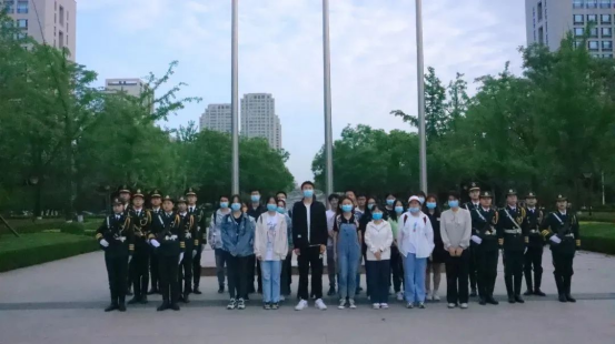 升旗仪式结束后,350vip8888新葡的京集团全体线下观礼师生与国旗护卫队合影留念。